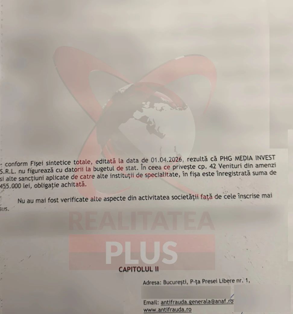 „Jurnaliștii Realitatea Plus au solicitat oficial de la ANAF să spună clar dacă în acel comunicat publicat este sau nu vizată Realitatea Plus, care este înregistrată sub firma PHG Media Invest SRL.”