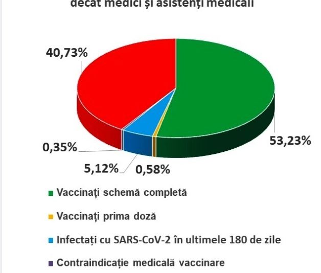 Astfel, procentul medicilor nevaccinați împotriva Sars-Cov-2 este de 28,42%, iar 0,22% au declarat că au contraindicații la vaccinare.