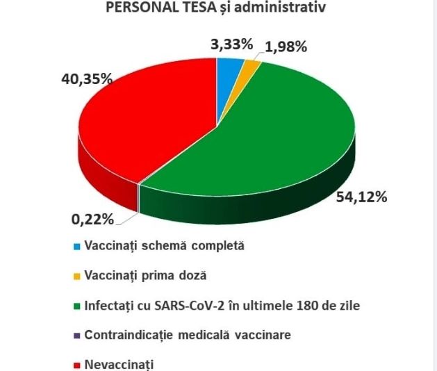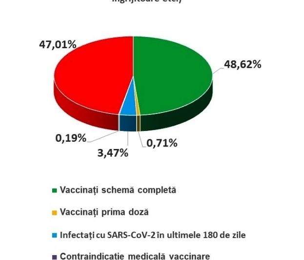 Peste 60% dintre angajații în spitalele publice sunt vaccinați60,14% dintre angajații în Sănătate sunt fie vaccinați, fie s-au infectat cu virusul SARS-C0V-2 în ultimele 6 luni și au anticorpii necesari, astfel că decizia individuală de vaccinare - în cazul lor - poate fi amânată fără a pune pe nimeni în pericol. Tot în această valoare procentuală a fost inclusă și categoria celor care au contraindicații medicale la vaccinare, dar numărul persoanelor înregistrate la această secțiune este foarte mic (sub 0,01%). Datele sunt valabile atât pentru personalul medical, cât și pentru personalul TESA și administrativ.39,86% dintre cei angajați în spitalele publice au decis să amâne, cel puțin deocamdată, vaccinarea, mai arată Sanitas.