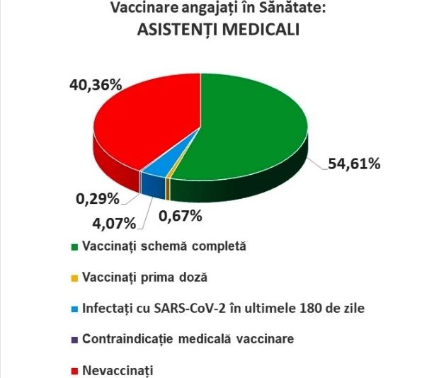 În ceea ce privește rata de imunizare în rândul asistenților medicali, 54,61% dintre aceștia au primit schema completă de vaccinare, 0,67% au primit prima doză, iar 4,07% au dezvoltat anticorpi în urma trecerii prin boală.