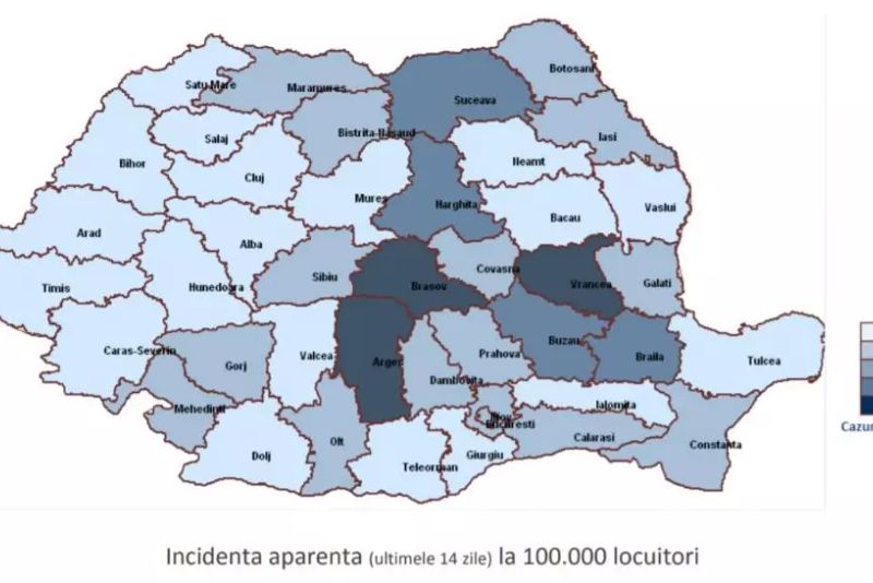 În județele Argeș, Brașov și Vrancea se înregistrează o rată de incidență cumulată peste 50/100.000 locuitori.