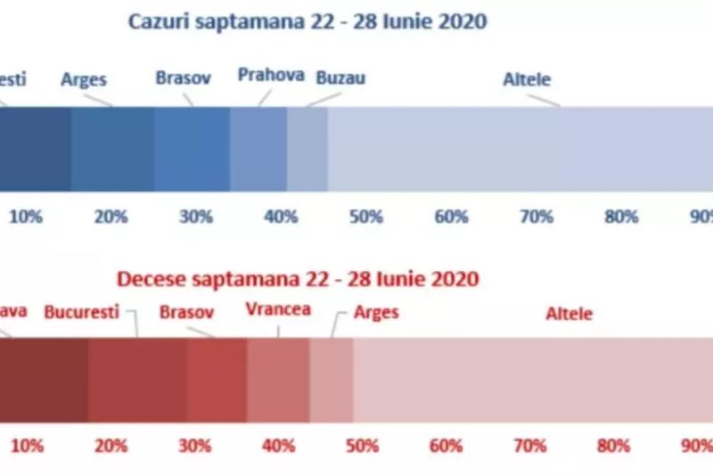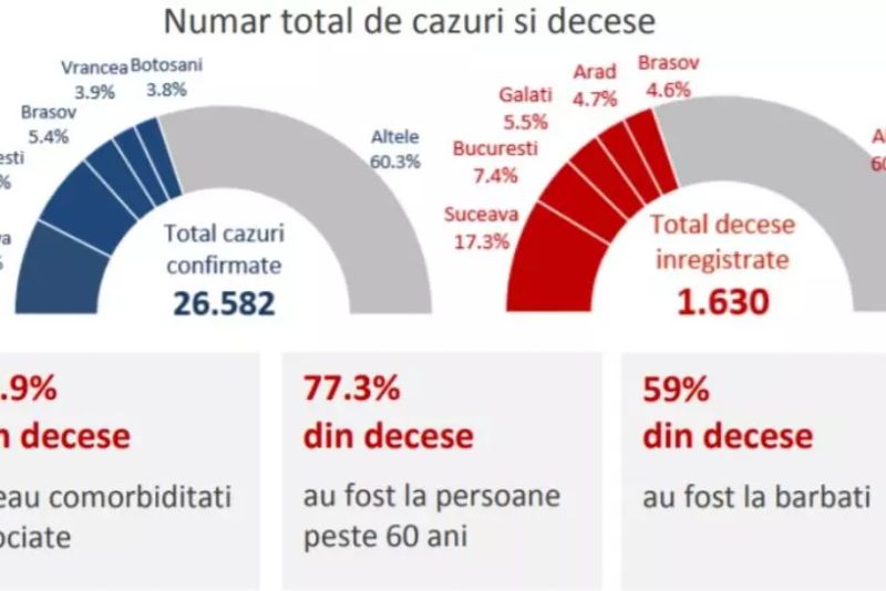 La fel și numărul celor care au murit din cauza COVID-19, astfel că 49,5% din totalul deceselor au fost înregistrate în Suceava, București, Brașov, Vrancea și Argeș.