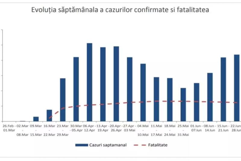 Potrivit graficului de mai jos, în ultima săptămână, din 22 iunie până în 28 iunie, numărul cazurilor de coronavirus a început din nou să crească, după aproape două luni în care a avut un trend descendent, început în timpul prelungirii stării de urgență.